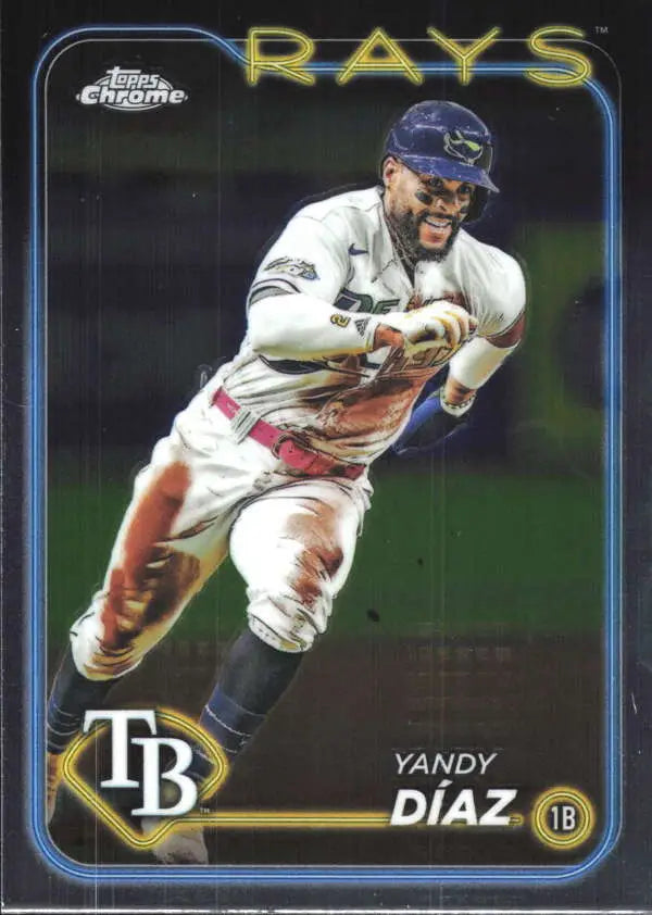 Up for sale is a 2024 Topps Chrome #107 Yandy Diaz NM-MT Tampa Bay Rays Baseball Card. This immaculate card features Yandy Diaz, a rising star in the MLB, in a stylish design typical of Topps Chrome cards.