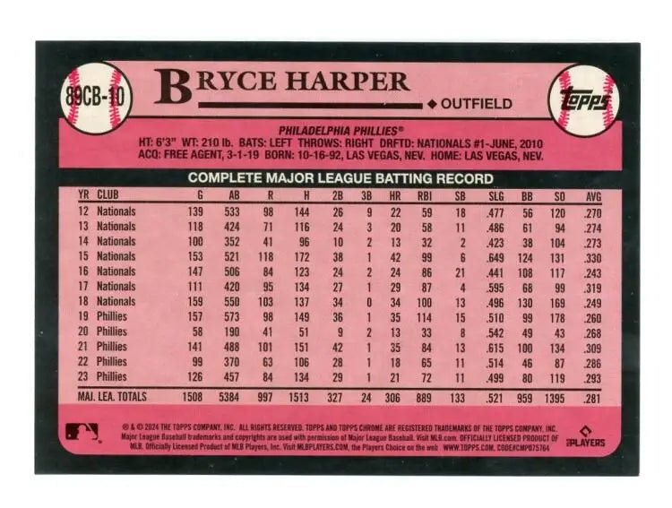 Get your hands on a piece of baseball history with the 2024 Topps Chrome 1989 Baseball Refractor #89CB-10 Bryce Harper NM-MT Philadelphia Phillies Baseball Card. This rare and highly sought-after card features the talented outfielder Bryce Harper in his Philadelphia Phillies uniform, making it a must-have for any collector or fan of the game.