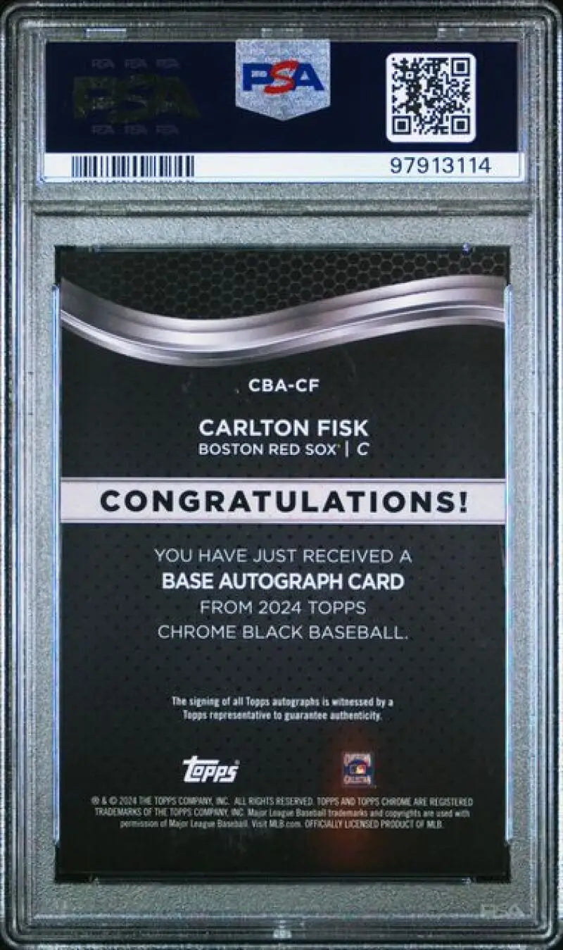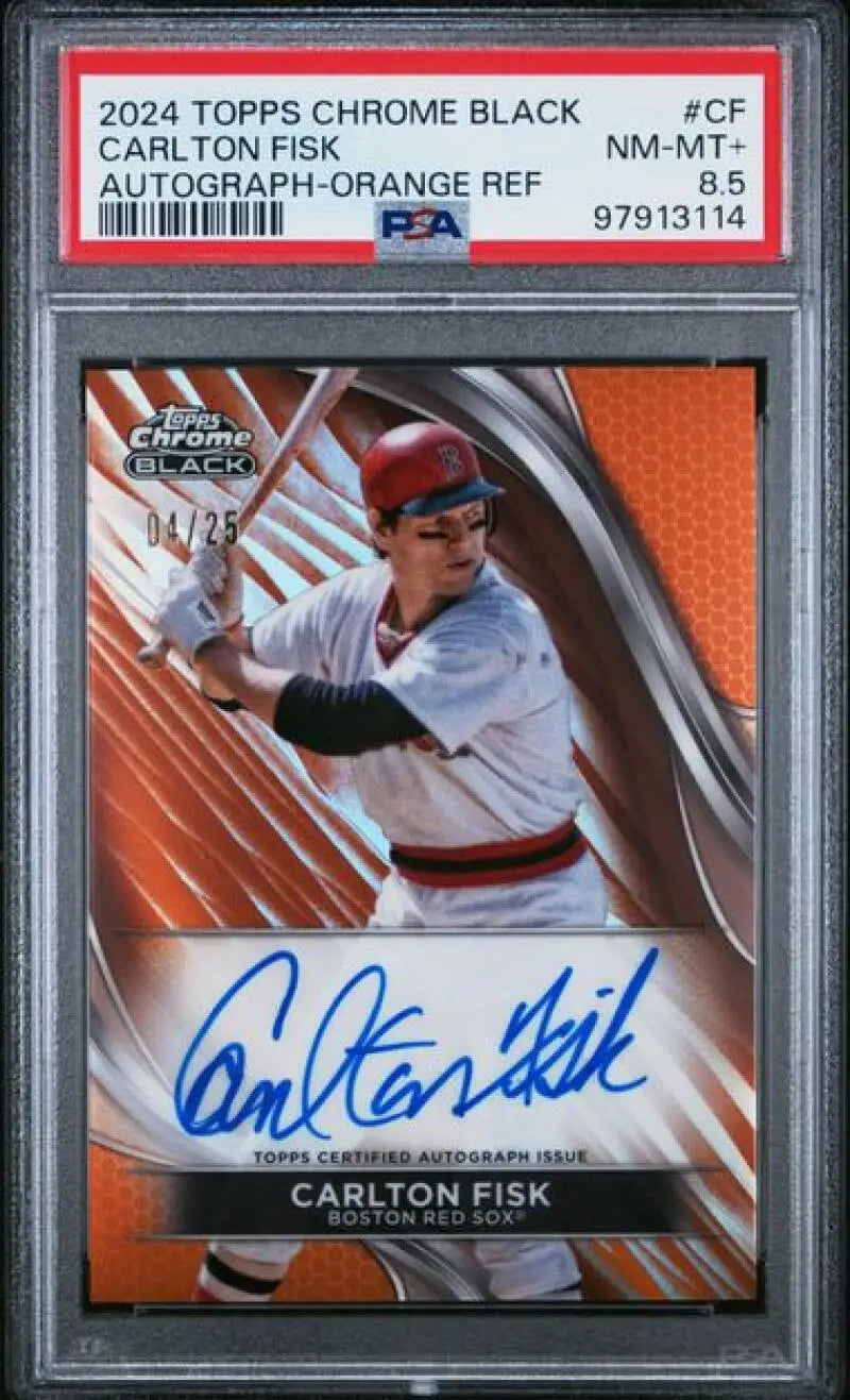 2024 Topps Chrome Black Refractor Orange #CBA-CF Carlton Fisk PSA 8.5 NM-MT-Plus Auto 4/25 Boston Red Sox Baseball Card