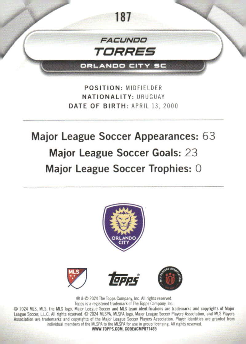 Whether you are a die-hard Orlando City SC fan, a collector of soccer memorabilia, or simply a fan of the sport, the 2024 Topps MLS Superstars #187 Facundo Torres card is a must-have item. Don't miss out on this opportunity to own a piece of soccer history with this unique and collectible card.