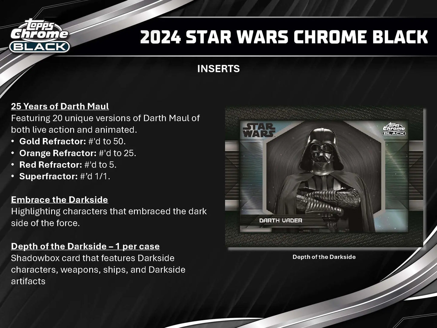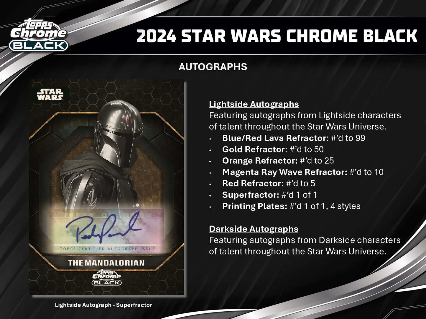 Back by popular demand, Star Wars Chrome Black returns and is better than ever! For the first time we will feature an encased auto and encased insert in Chrome Black for either Lightside or Darkside characters. You also get one refractor #’d parallel per box.