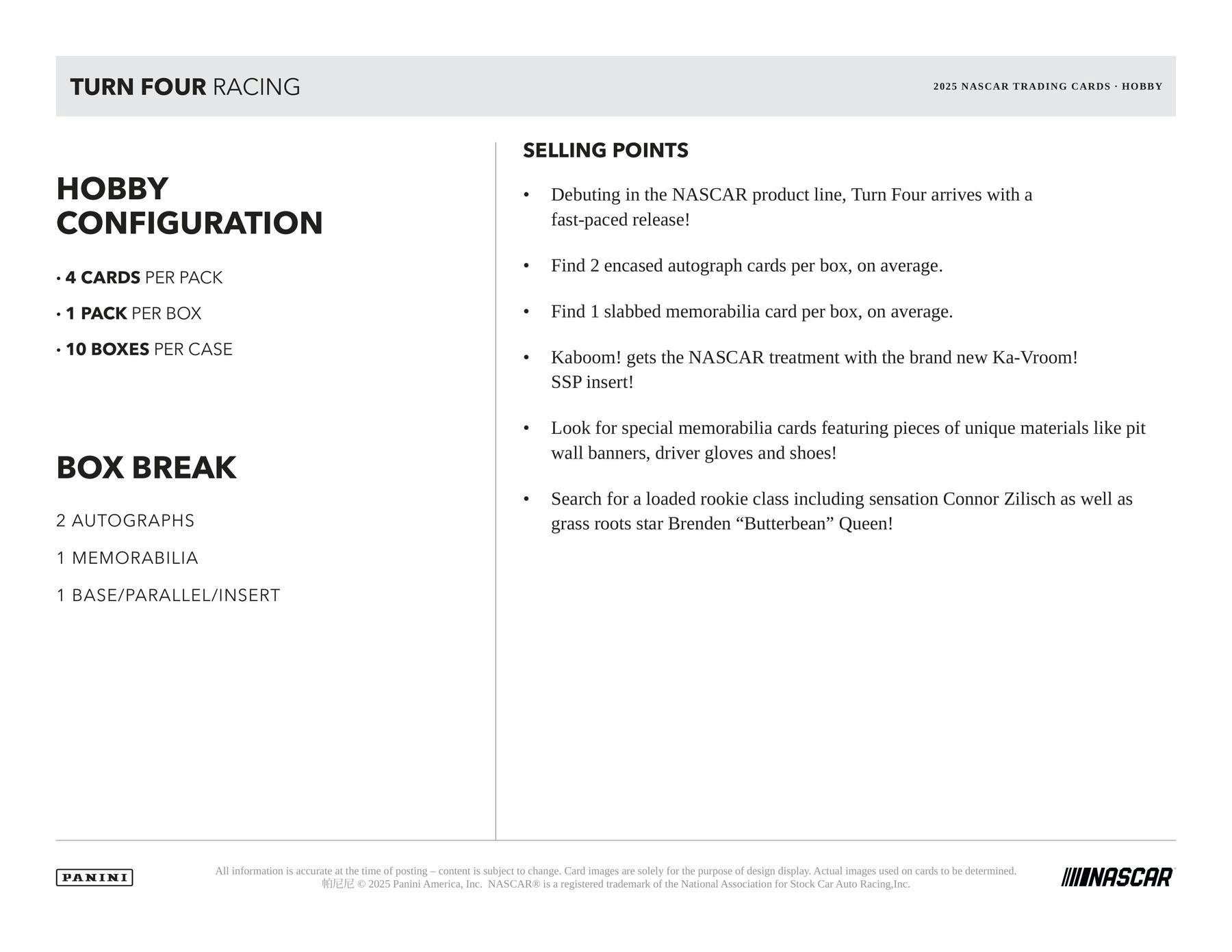 2025 Panini Turn Four Racing Hobby Box makes its NASCAR debut with encased autographs, slabbed memorabilia, and a brand-new SSP insert! Each box delivers 2 autographs, 1 memorabilia card, and 1 base/parallel/insert card, on average.