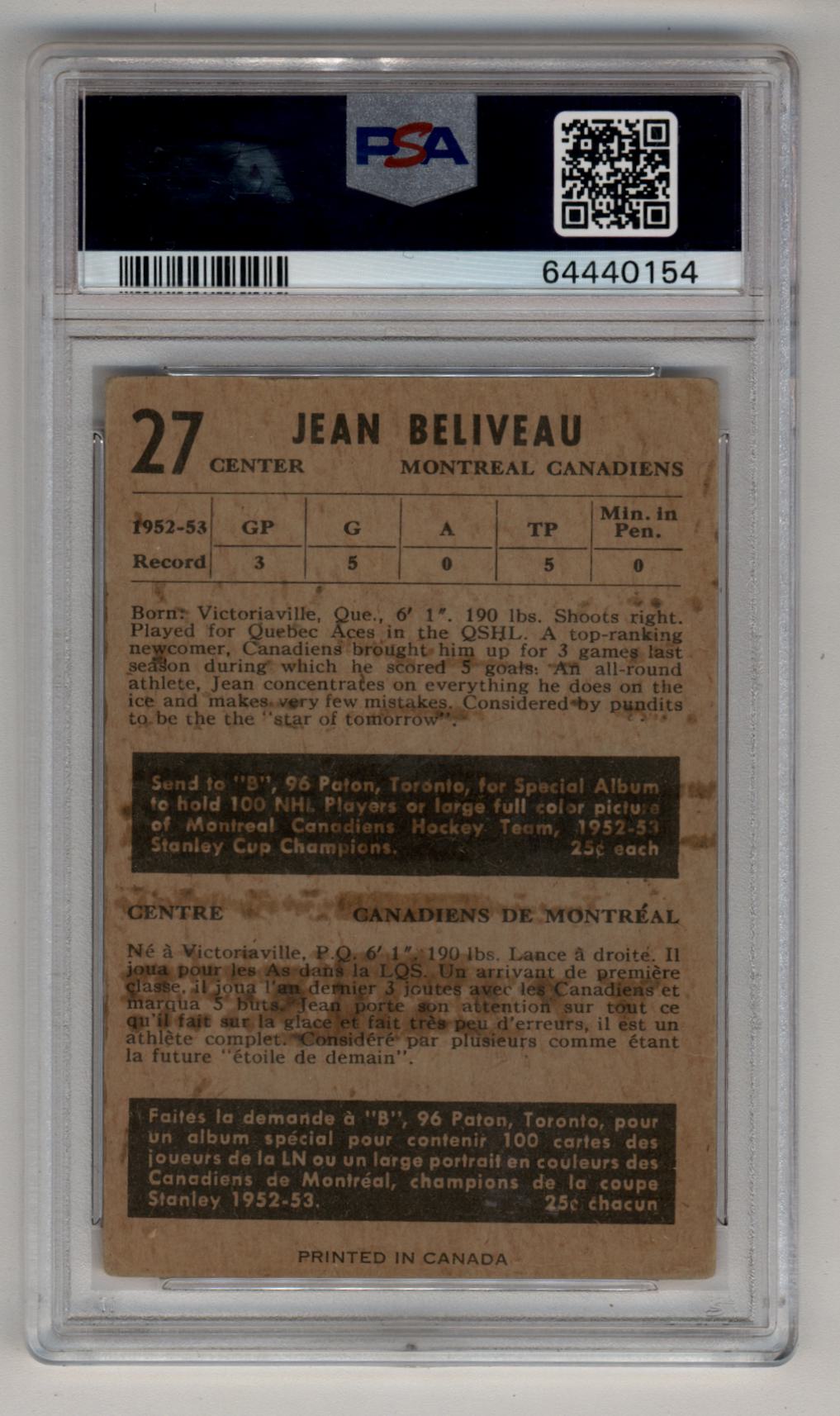 Jean Beliveau 1953-54 Parkhurst #27 Rookie PSA 2.5 Good+