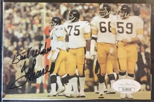 The product is a vintage magazine photo featuring Joe Greene, a Hall of Fame football player from the Pittsburgh Steelers. The photo measures approximately 4x6 inches and is signed by Greene, with the authenticity of the autograph verified by James Spence Authentication (JSA). This item is an original piece and would make a valuable addition to any football memorabilia collection, especially for fans of the Pittsburgh Steelers or collectors of NFL autographs.