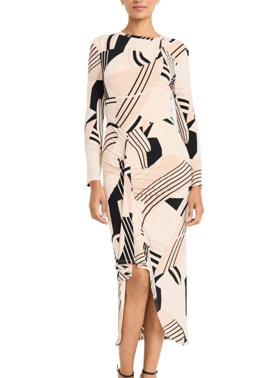 This stunning geo-print dress is a true masterpiece, boasting long fitted sleeves, a twisted crew neckline with a keyhole shoulder detail, and a high-low midi skirt with elegant triangular draping.