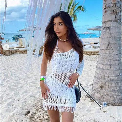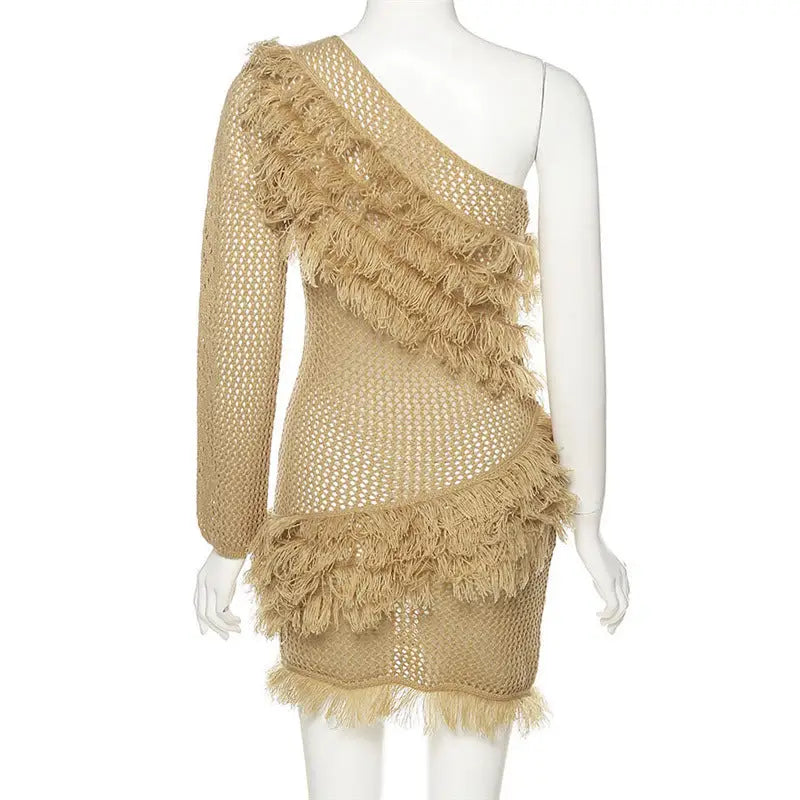 Plaid Tassel Skirt Sexy See Through Inclined Shoulder Dress