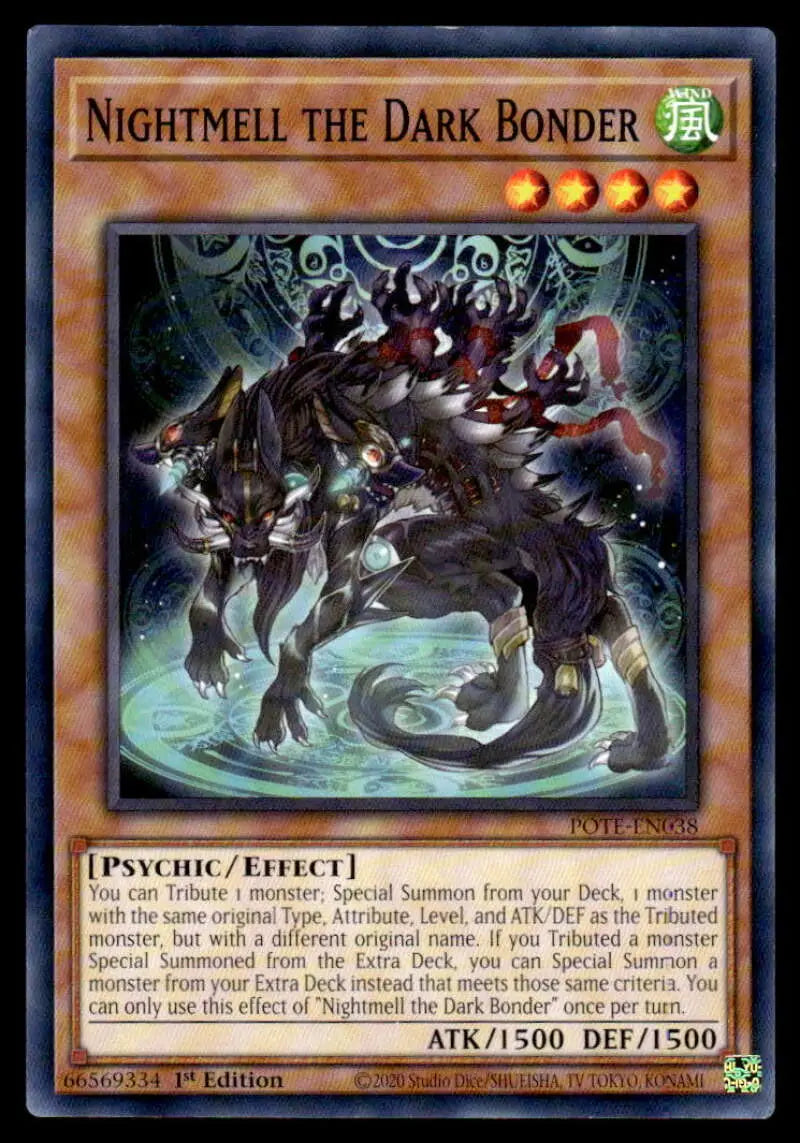 Introducing the Power of the Elements #POTE-EN038 Nightmell the Dark Bonder, a must-have addition to any serious Yugioh Trading Card collector's deck. This powerful card is sure to bring an element of darkness and mystery to your battles, making it a formidable opponent for any challenger.