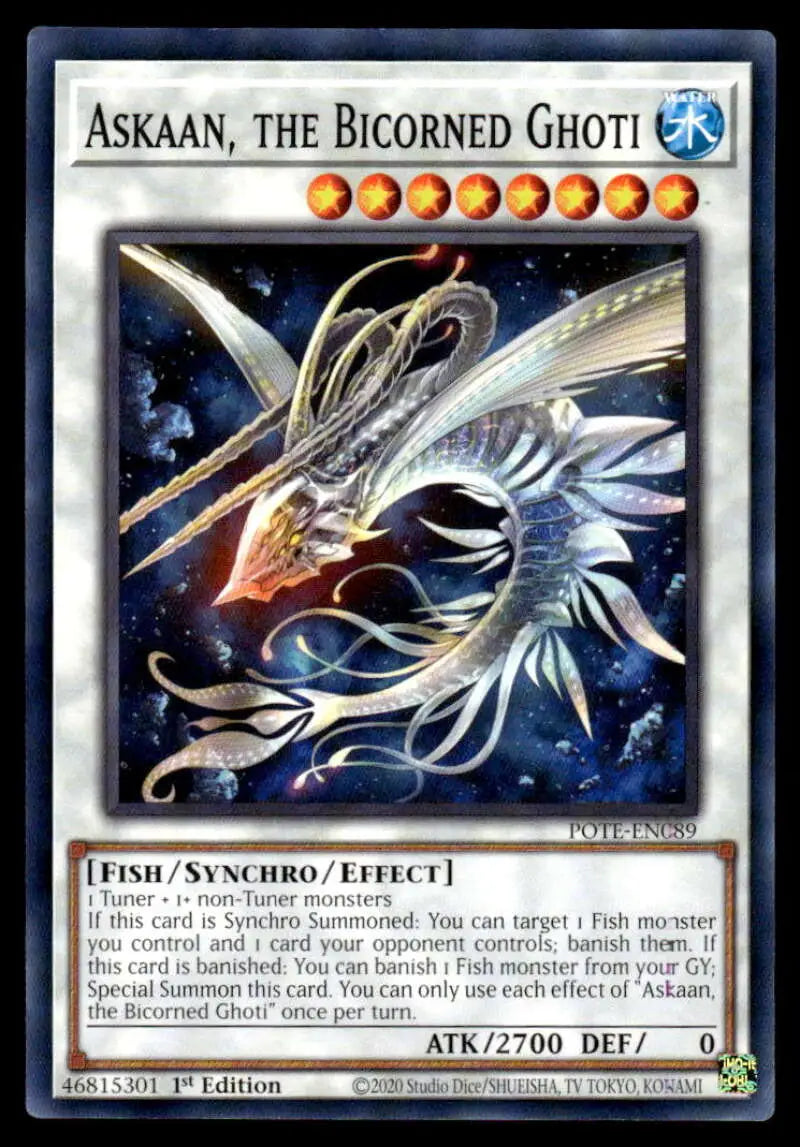 Power of the Elements #POTE-EN089 Askaan, the Bicorned Ghoti is a powerful and unique addition to any Yugioh Trading Card deck. This monster card features a stunning design with intricate details that are sure to impress both collectors and players alike. Askaan, the Bicorned Ghoti stands out from other cards with its mystical appearance and formidable abilities.