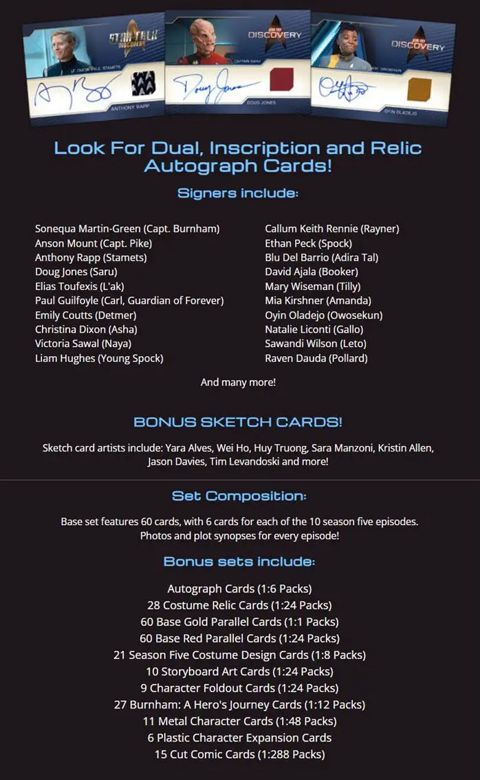 This all-new series of Discovery cards will feature 4 Autograph cards and 1 Relic card per box, and the autograph list is loaded with stars! Sonequa Martin-Green, Anson Mount, Ethan Peck, Doug Jones, Mary Wiseman, Mia Kirshner, David Ajala, Anthony Rapp and many others highlight the list of signers. Plus loads of relic cards, autograph/relic cards, sketch cards, dual autograph cards, inscription autograph cards and much more.