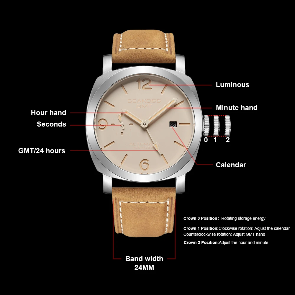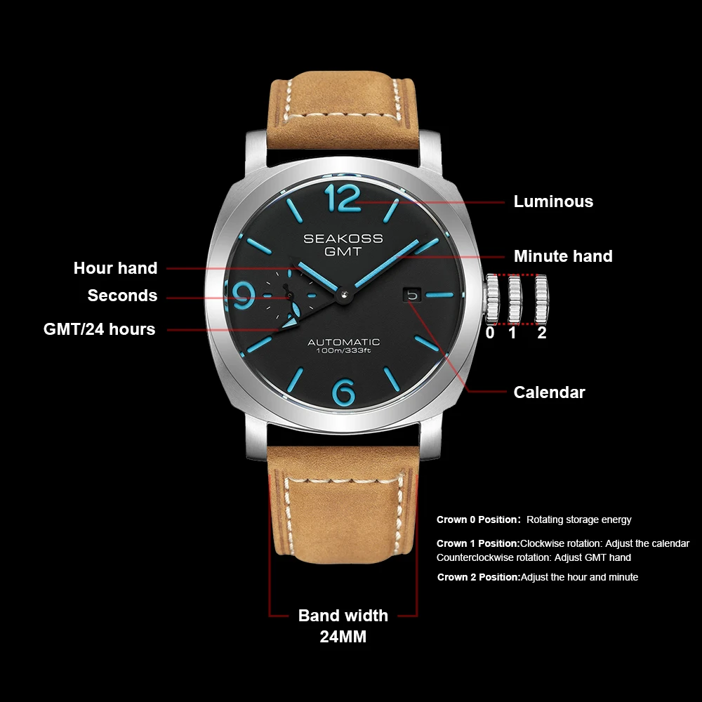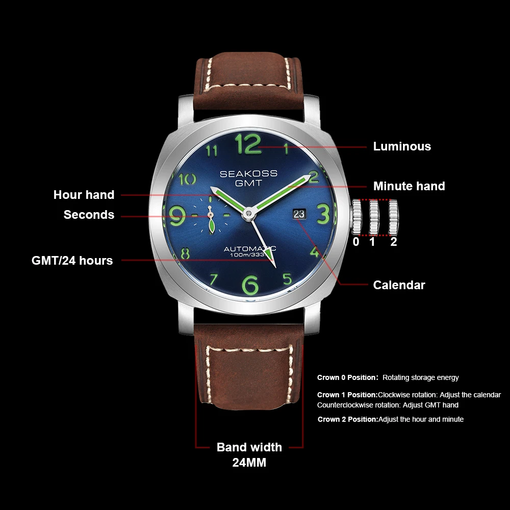 Function: 100m Waterproof, Calendar, Super Luminous, GMT/24 Hours