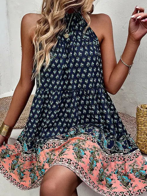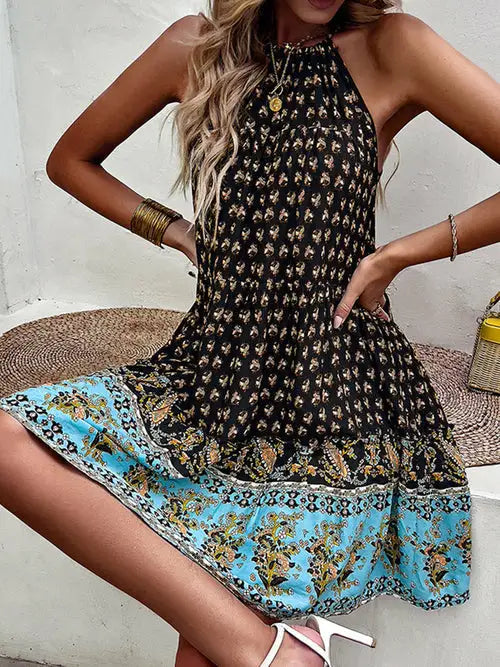Elevate your summer party look with the gorgeous Sexy Back Lace-up Hollow Pleated A-line Dress Mujer. This dress features a flattering A-line silhouette, an elegant O-neckline, intricate printing decoration, and a chic Bohemian style. Made from a blend of high-quality cotton and polyester, this dress is perfect for staying cool and stylish in the warm summer months. With its above knee, mini length and pullover closure type, this dress is a must-have for any fashion-forward woman.