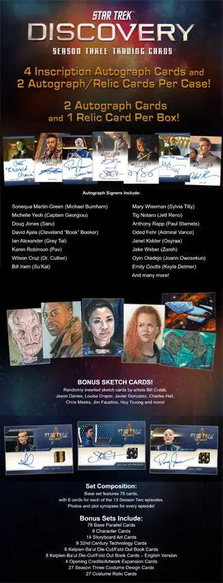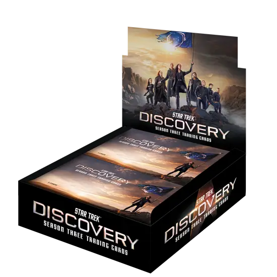 Full, factory-sealed box (24 Packs) of Star Trek Discovery Season 3 Trading Cards! 2 Autograph Cards and 1 Relic Card Per Box! Look for Dual Autograph Cards, Full Bleed Autograph Cards and more!