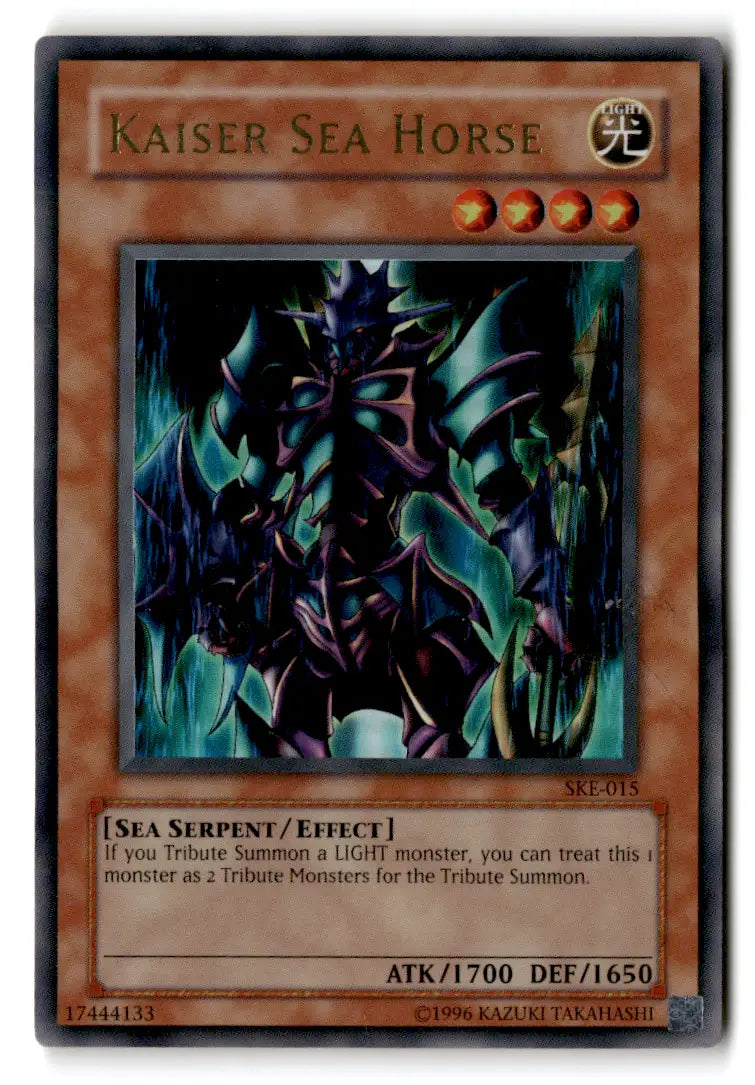 The product is a Yu-Gi-Oh! trading card featuring Kaiser Sea Horse as a Sea Serpent creature. It is from the Yu-Gi-Oh! TCG set, with card number SKE-015. The card is of Light attribute, with 1700 Attack/Power and 1650 Defense/Toughness. It has a Holo finish and is made of card stock. The card is in English language, manufactured by Konami in 1996, and is an original print. Autographed status is not mentioned.